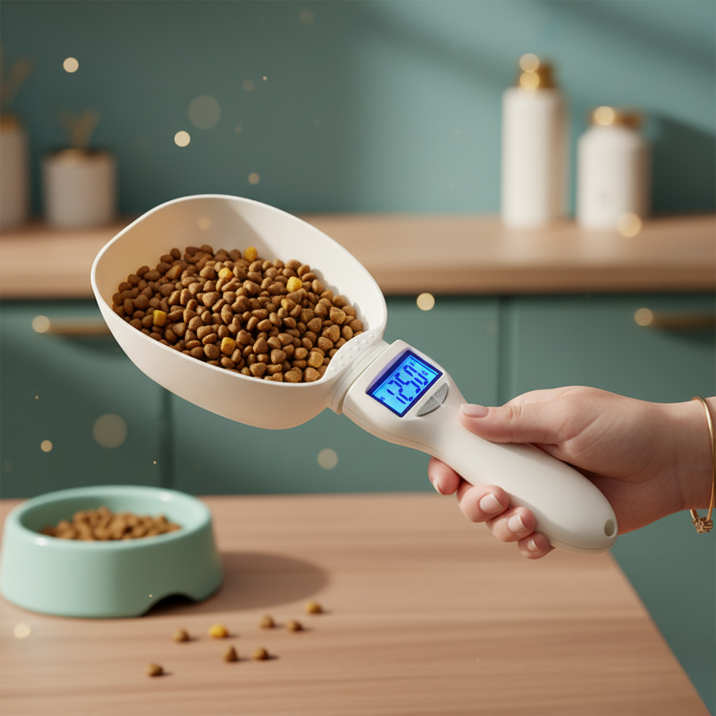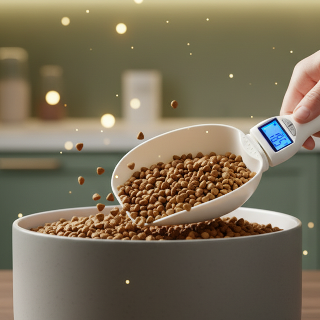 Dankzij de ingebouwde digitale weegschaal weeg je eenvoudig de perfecte portie af. Geen gedoe meer met aparte bakjes of schattingen: Scoopie geeft je direct de juiste hoeveelheid voeding, afgestemd op de behoeften van jouw huisdier. Zo zorg je voor precisie en gemak!